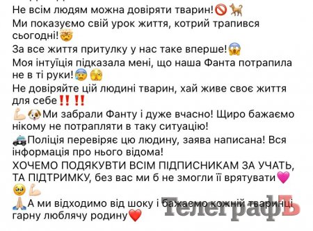— До мене стукали жінки, яких я не знаю. Згодом до мене постукала сусідка. Я відчинив двері, жінки почали гукати Фанту. Собака вийшла, вони схопили її, і, нічого не пояснюючи, зникли. Як виявилося, жінки вистежили, де я проживаю, щоб забрати собаку, — говорить Максим.