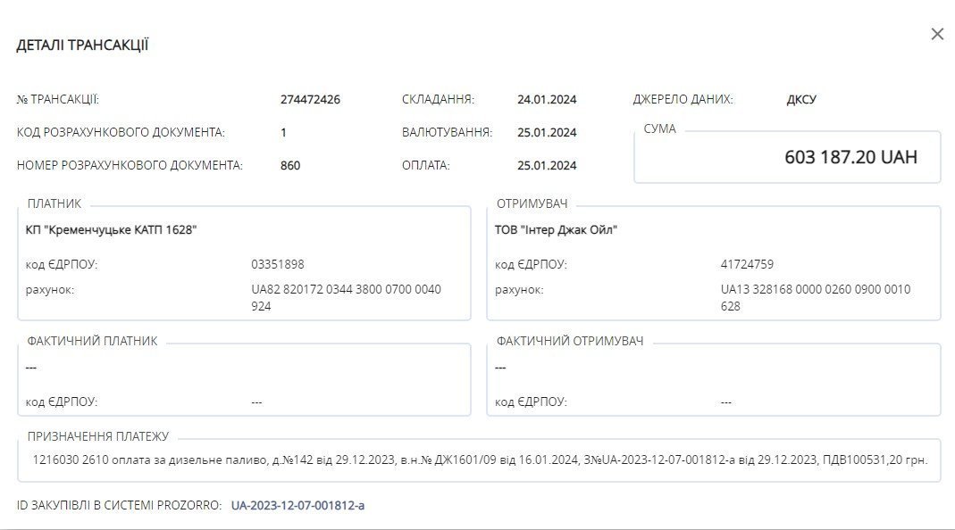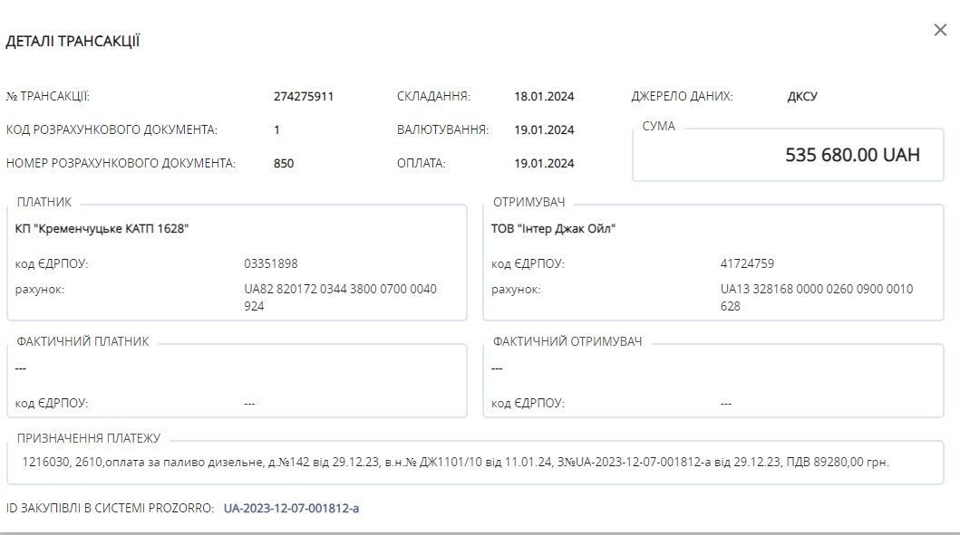 Довідково: ТОВ «Інтер Джак Ойл» зареєстроване у Кременчуці. Його директоркою на кінцевою бенефіціарною власницею з 2023 року є Вітер Олена Анатоліївна. Вік підприємства 6 років, основний вид діяльності «Оптова торгівля твердим, рідким, газоподібним паливом і подібними продуктами». До початку повномасштабного вторгнення росії підприємство не брало участь у державних закупівлях. Перший контракт отримало від КАТП 1628 у 2022 році. Відтоді це комунальне підприємство залишається найбільшим замовником ТОВ «Інтер Джак Ойл». Цей постачальник має контракти й з іншими КП, але тільки кременчуцькими і не на такі великі суми, як КАТП 1628.