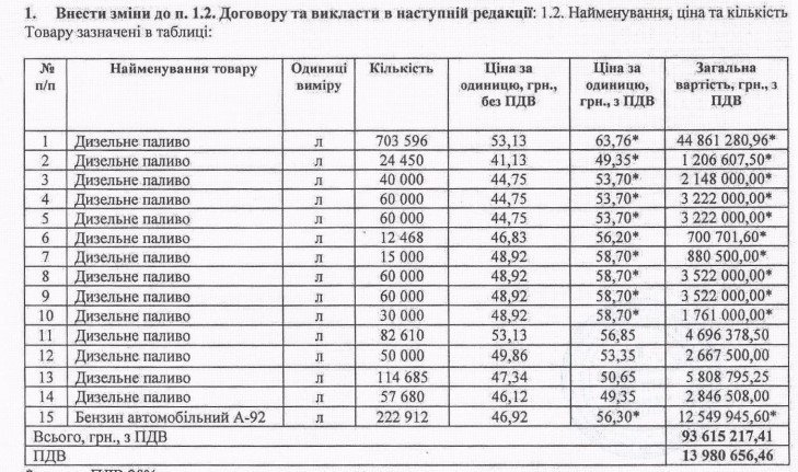 - 1 500 000 л дизельного палива на суму 86 млн 400 тис. грн — по 57,6 грн за л.