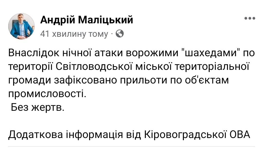 Світловодську громаду Олександрійського району Кіровоградської області також атакували російські дрони. Були удари по об'єктах промисловості. Люди не травмовані. Про це написав у Facebook Світловодський міський голова Андрій Маліцький.