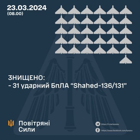 О 8.00 Командувач Повітряних Сил ЗСУ повідомив, що в ніч на 23 березня 2024 року противник атакував чотирма зенітними керованими ракетами С-300 (по Донеччині) та 34 ударними БпЛА типу «Shahed» (райони пусків Курська обл. - рф, мис Чауда – Крим).