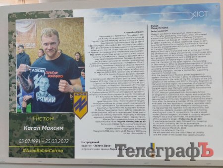 Мати кременчужанина Максима Кагала Тетяна, яка допомагала з організацією виставки у Кременчуці, розповіла, що сьогодні, 25 березня, рівно два роки, як у бою за Маріуполь загинув її син.