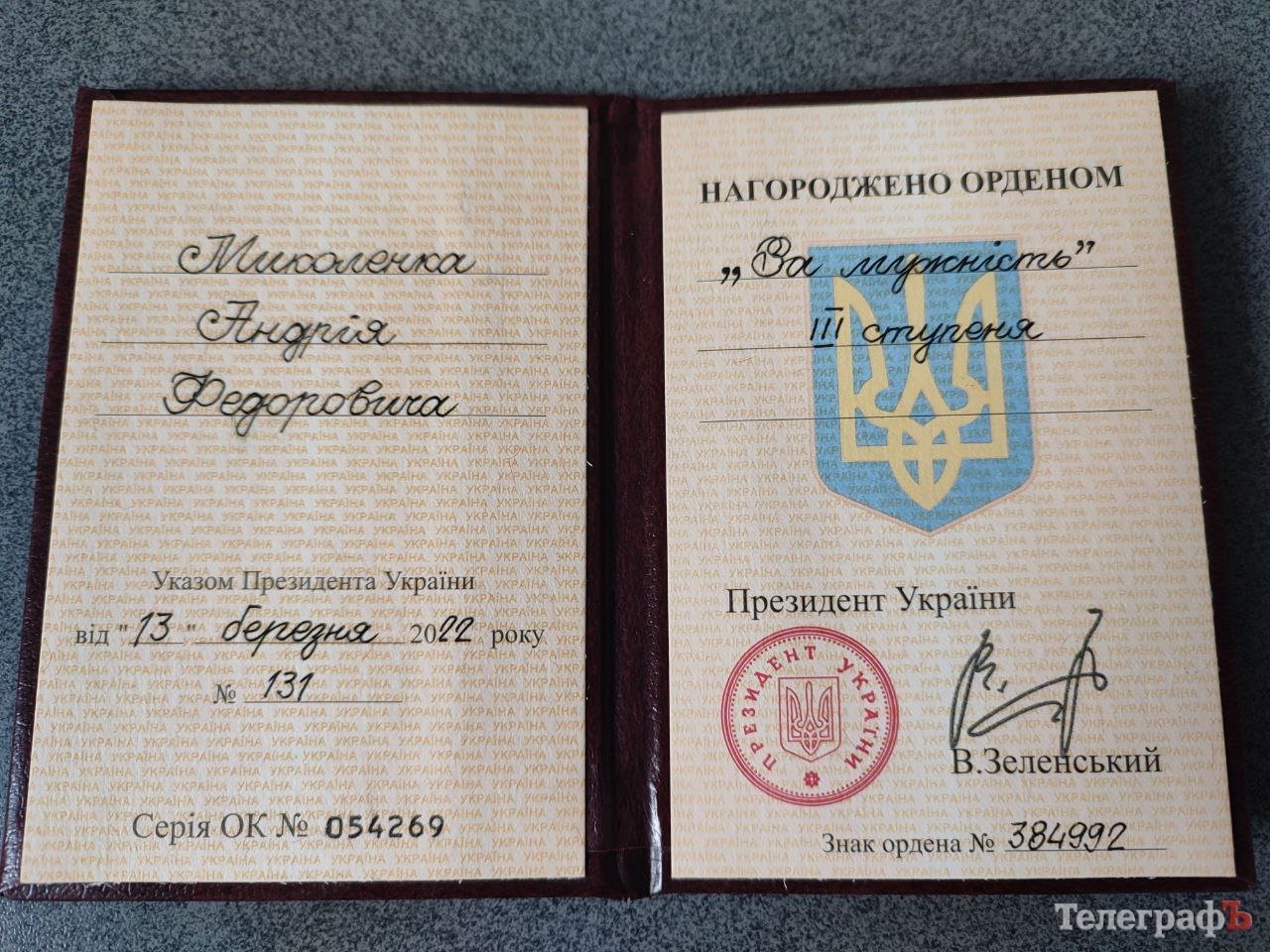 Капітан Андрій Миколенко має бойові нагороди. Орден «За мужність» III ступеню він отримав у березні 2022 року за знищення 4-х одиниць бронетехніки ворога під Києвом. А від рідної 72-ї омбр офіцер отримав нагрудний знак «Хрест Чорних Запоріжців».