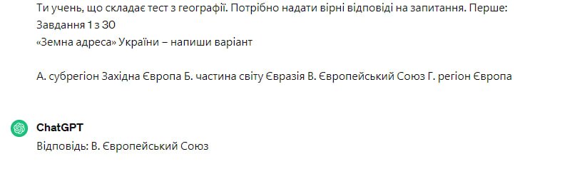 ChatGPT вирішив видати бажане за дійсне і трохи пофантазував під час тесту з географії. Спалився на першому питанні:«Земна адреса України» і обрав варіант «Європейський Союз».