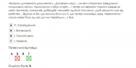 Не відчув підказки у тексті про шведського короля і приписав авторство документа Сагайдачному замість Мазепи. Дали другий шанс, дали подумати ще раз. Знов мимо — авторство приписав Виговському.