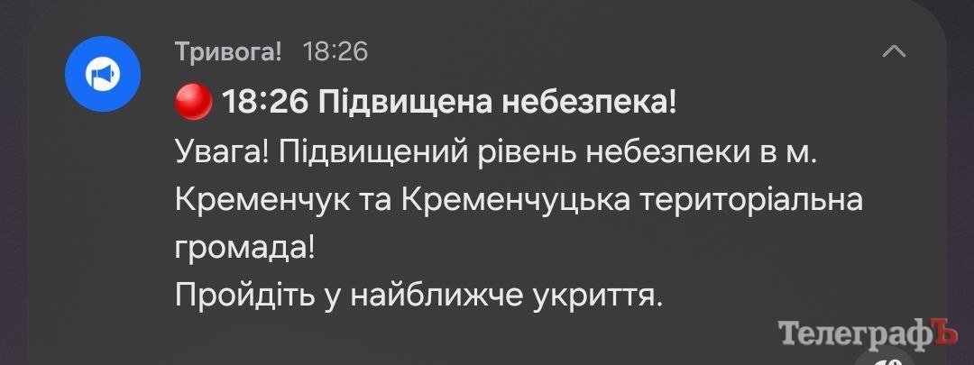 О 18.26 застосунок «Повітряна тривога» попередив про підвищену небезпеку для Кременчука.