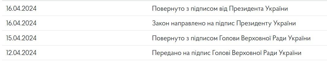 Попередньо 11 квітня Верховна Рада України у другому читанні ухвалила законопроєкт про мобілізацію. Тоді ж наступного дня законопроєкт передали на підпис Голові Верховної Ради Руслану Стефанчуку. Він повернув законопроєкт із підписом учора, 15 квітня. А вже сьогодні документ віддали на підпис Президентові.