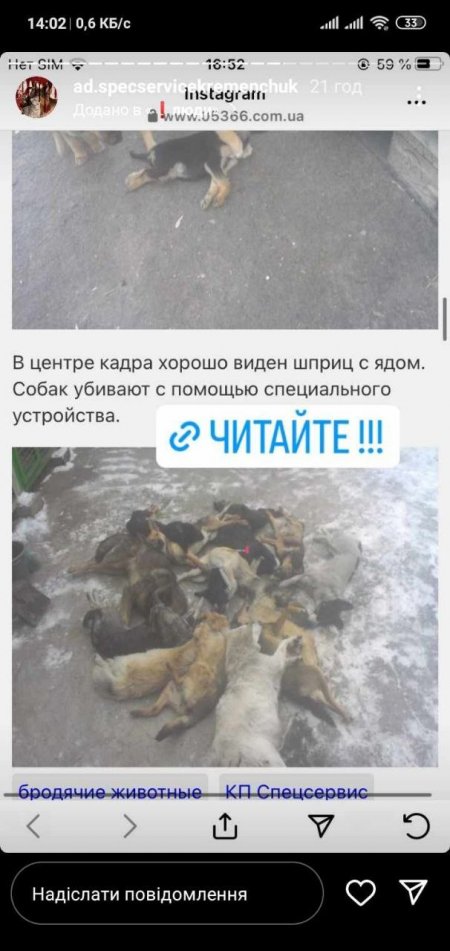 У соціальній мережі Instagram з’явилася група під назвою ad.specservicekremenchuk, де нібито повідомляють «шокуючу правду о «Спецсервісі». На сторінці — відео з трупами тварин і розповідями, що коти та собаки померли у «Спецсервіс-Кременчук» в муках, не отримавши належної допомоги та догляду. Дописи викликали шквал обурення з боку містян і безліч коментарів. Думки кременчужан розділилися: дехто вважає докази сфабрикованими, дехто — що тварин треба терміново рятувати.