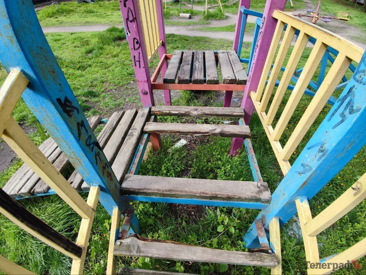 Утім, те що цей дитячий майданчик давно ніхто не фарбував не найгірше. Страшніше те, що дерев’яні сходинки та сидіння гойдалок давно прогнили, або взагалі вирвані, металеві листи на грибочку відірвані та загрозливо стирчать гострими кутами, а під рідкими й прогнилими сходинками конструкцій розсипи битого скла. Одним словом — повний екстрим.