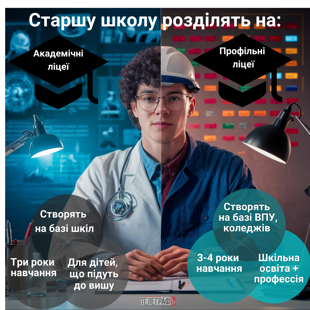 Академічні ліцеї навчатимуть учнів 10-12 класу: діти зможуть обирати профілі навчання, поглиблено вивчатимуть певний напрям і фактично готуватимуться до вступу в заклади вищої освіти. А в професійних ліцеях учні не лише здобуватимуть загальну середню освіту, але й обраний фах. Загальний тренд — популяризувати професійну освіту, аби йшли не у виші, а вже з 9 класу опановували фах у професійних ліцеях.