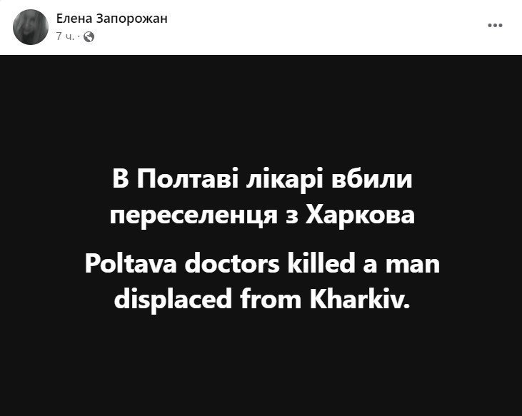 «В Полтаві лікарі вбили переселенця з Харкова». Таке повідомлення з’явилося на фейсбук-сторінці полтавки Олени Запорожан, власниці майстерні з виготовлення амуніції та тактичного одягу для військових.