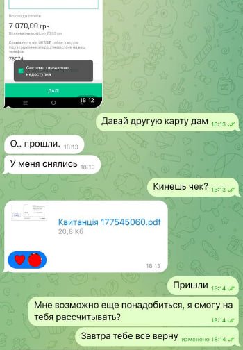Шахрай навіть попрохав жертву надіслати квитанцію про переказ. А далі ще про всяк випадок поцікавився, чи не зможе людина, яка щойно перевела 7 тис. грн, надіслати ще коштів.