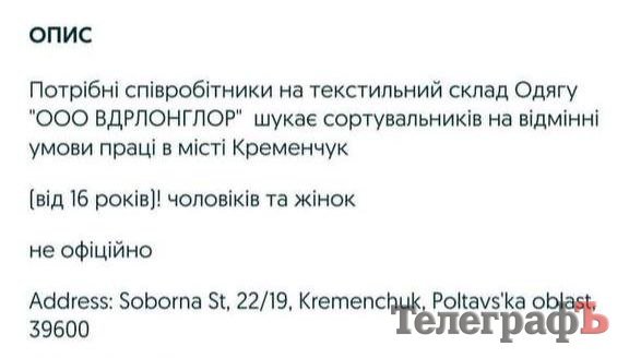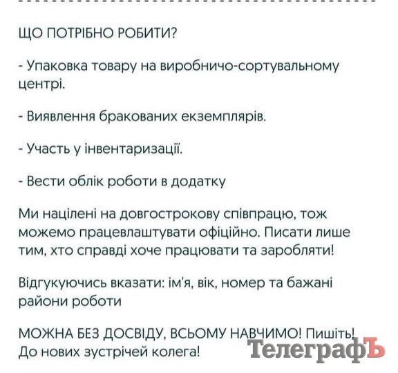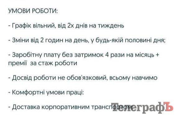Працевлаштування неофіційне, проте досвід роботи необов’язковий — усьому обіцяли навчити. Комфортні умови праці, доставка корпоративним транспортом — лише приходь і працюй!