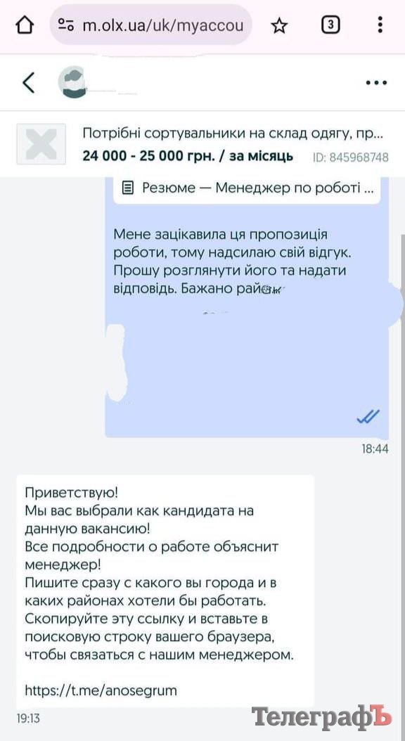 Надію вакансія зацікавила, тож вона вирішила відгукнутися — надіслала резюме та залишила контактні дані. Приблизно через пів години їй прийшла відповідь від менеджера. Жінку відібрали як кандидатку на вакансію та надіслали посилання на телеграм, де вже інший менеджер мав би детальніше ознайомити її з особливостями роботи.