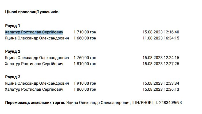 Нам трапилось ще два цікавих аукціони. У липні 2023 року ФОП Яцина Олександр Олександрович на аукціоні виборов право оренди земельної ділянки на вул. Соборній, 5/9. Площа — 24 кв. м. Земельна ділянка передається в оренду для розширення основної території на вул. Соборній, 5/9. Цільове призначення — для будівництва та обслуговування будівель торгівлі. Строк оренди — 49 років, вартість оренди — 7800 грн (ми так зрозуміли, що в рік). Та виграв аналогічний аукціон на 8 кв. м у тому ж подвір'ї, вартість оренди приблизно 1700 грн.