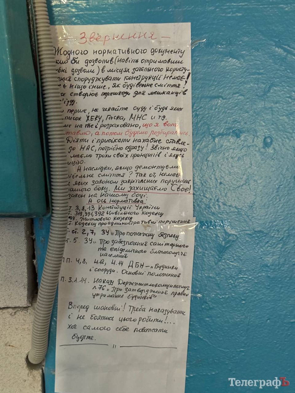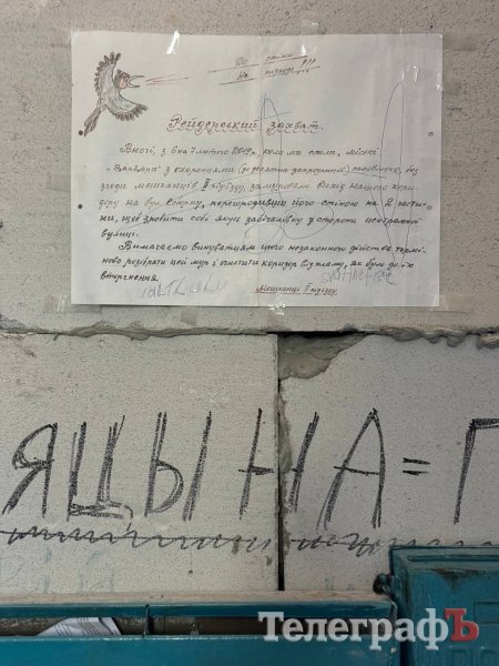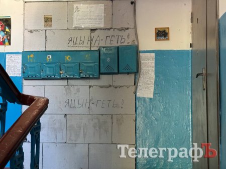 А такий вигляд зараз має частина під'їзду, що залишилась у мешканців — це вхід з двору. Поштові скриньки довелось повісити прямо на «стіні плачу». Вона також стала місцем самовираження мешканців: