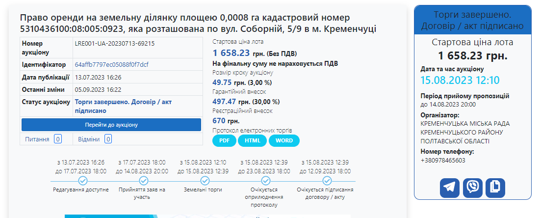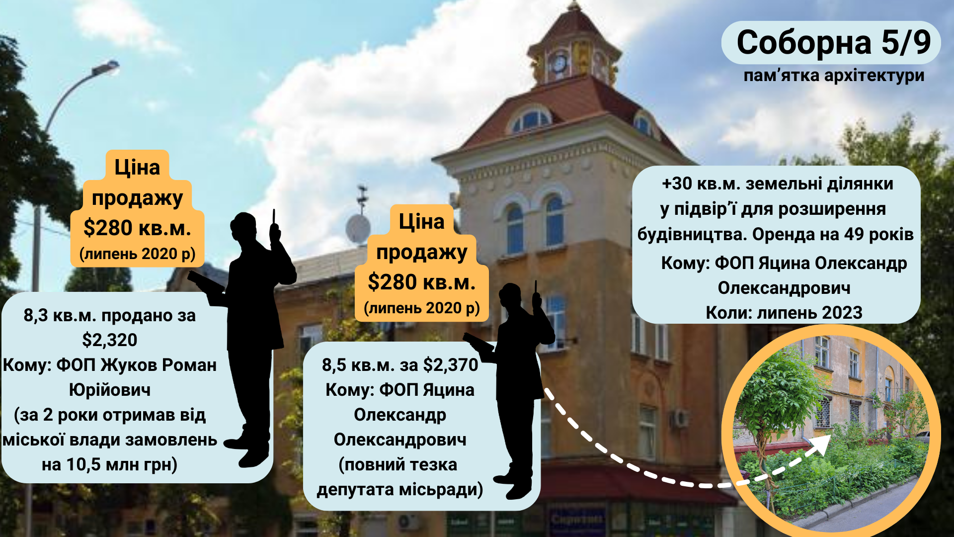 Нам трапилось ще два цікавих аукціони. У липні 2023 року ФОП Яцина Олександр Олександрович на аукціоні виборов право оренди земельної ділянки на вул. Соборній, 5/9. Площа — 24 кв. м. Земельна ділянка передається в оренду для розширення основної території на вул. Соборній, 5/9. Цільове призначення — для будівництва та обслуговування будівель торгівлі. Строк оренди — 49 років, вартість оренди — 7800 грн (ми так зрозуміли, що в рік). Та виграв аналогічний аукціон на 8 кв. м у тому ж подвір’ї, вартість оренди приблизно 1700 грн.