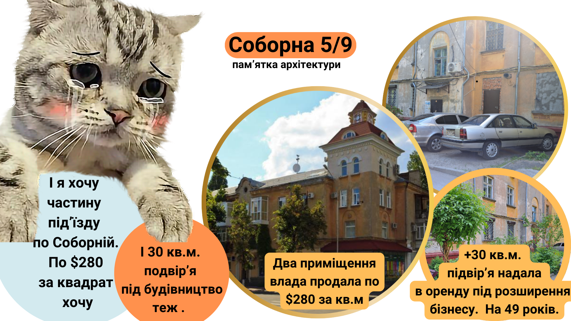 Як колишні входи до будинку опинились у приватній власності? У 2016-2017 роках Бюро технічної інвентаризації раптом виявляє, що парадні входи до будинку, який існує понад 60 років, це окремі приміщення. Влада приймає їх до комунальної власності та одразу віддає в оренду. У 2019-му один орендар починає ремонт, робить додаткову стіну, аби відрізати частину під’їзду. Мешканці звертаються до суду. Автозаводський райсуд скасовує рішення міської ради, якими вона включила «приміщення» на Соборній до переліку комунальної власності. Суд приходить до висновку, що то частина сходових клітин, тож перебуває у співвласності мешканців будинку.
