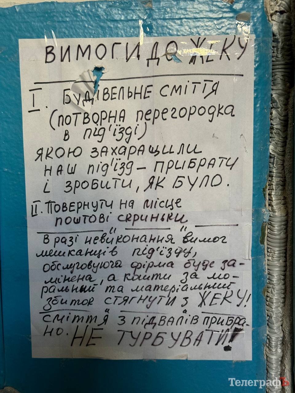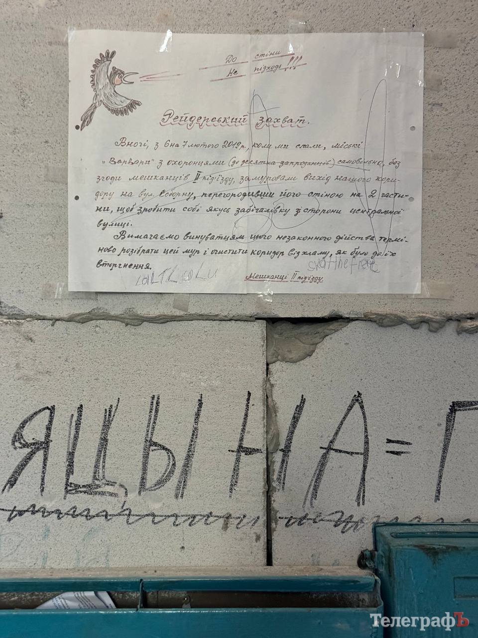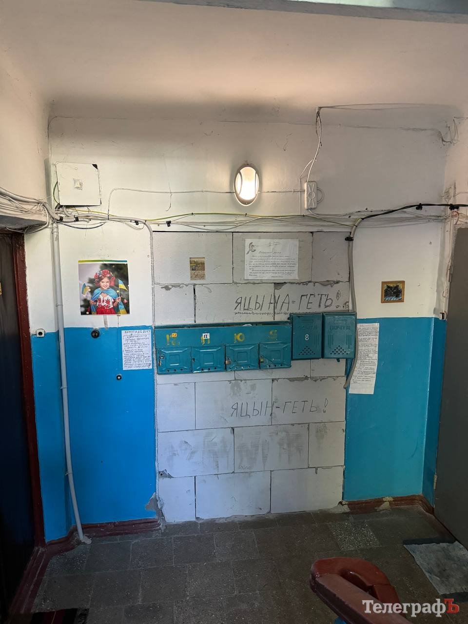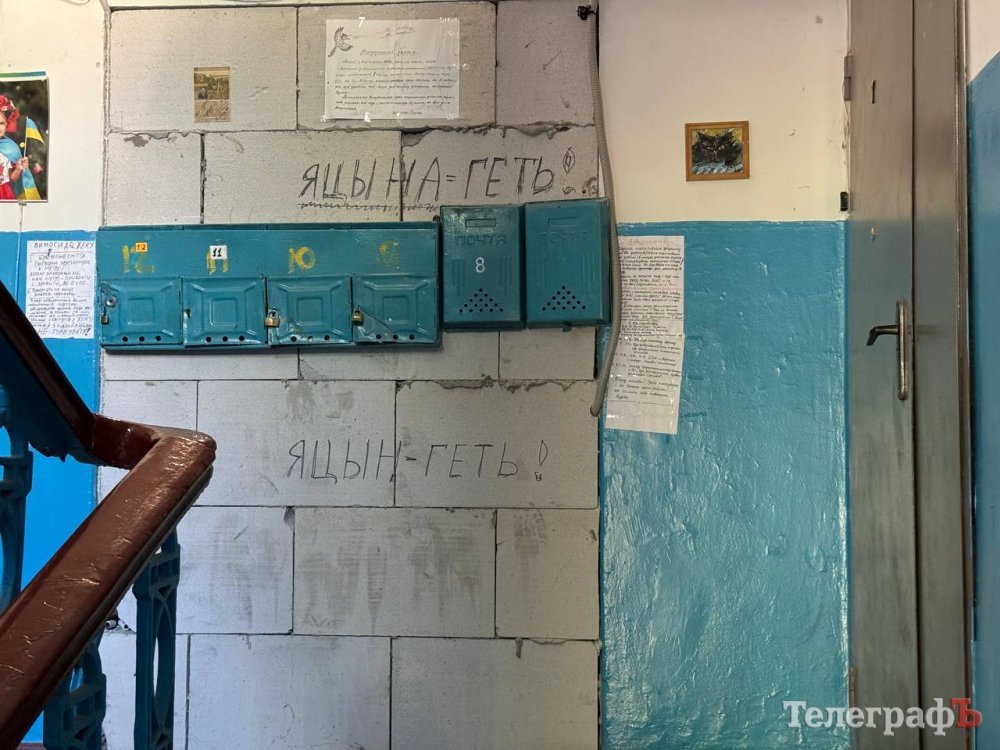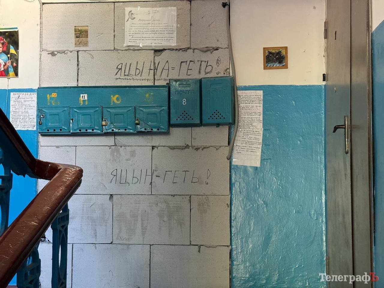 А такий вигляд зараз має частина під’їзду, що залишилась у мешканців — це вхід з двору. Поштові скриньки довелось повісити прямо на «стіні плачу». Вона також стала місцем самовираження мешканців:
