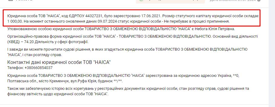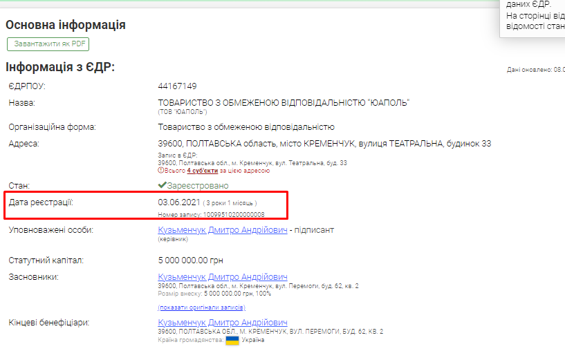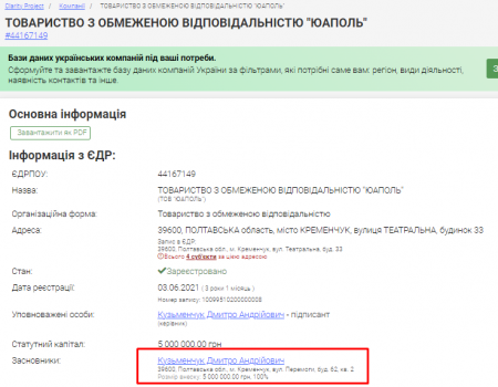 Згідно з даними з Єдиного державного реєстру, вид діяльності компанії «ЮАПОЛЬ» — діяльність у сфері фотографії. Засновник — Кузьменчук Дмитро Андрійович.