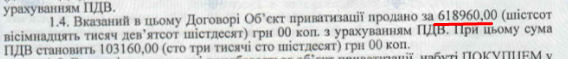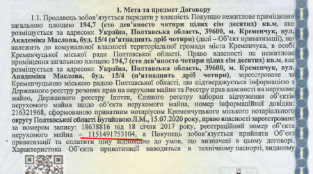 У листопаді 2019 року орендарю дають добро згоду на здійснення невід’ємних поліпшень. Підприємець вкладає у ремонт понад 86% від «ринкової вартості об'єкта». У квітні 2020, у самий розпал «ковіду», орендоване приміщення включають до списку об'єктів, що підлягають приватизації. У той же ковідний липень, міська влада погоджує умови продажу (близько 620 тис. грн) та підписує з орендарем договір купівлі-продажу. Згідно з курсом валют на день укладення договору (27,15 грн за дол), кременчуцька громада за приміщення на перетині Соборної та Перемоги, розміром з дві трикімнатні «хрущовки» отримала приблизно за $23 тис. Ось скрін з договору купівлі-продажу від 15.07.2020 р.