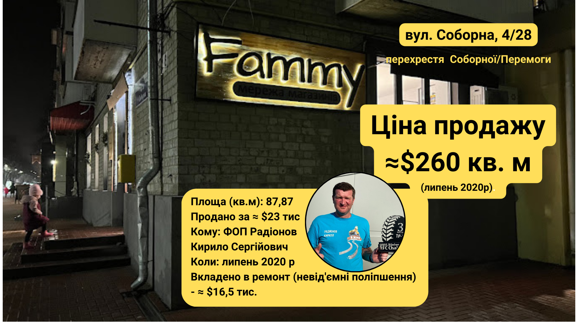 ФОП Радіонов нам вже знайомий по приватизації приміщення комунальної аптеки по вул. Соборній, де зараз знаходиться Fammy. За дивним збігом обставин, по вул. Маслова 15/4 ми також зустріли цей магазин.