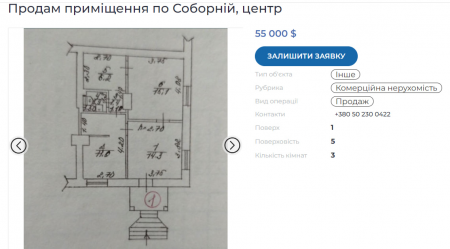 А от приміщення для бізнесу у центрі коштує в 4 рази дорожче. Приклад продажу трикімнатного офісу по вул. Соборній. Вартість — близько $1200 за кв. м.