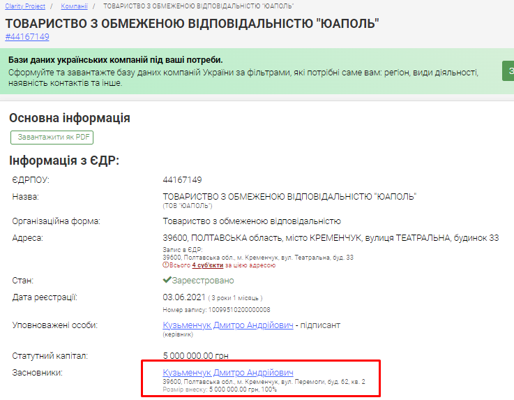 Згідно з даними з Єдиного державного реєстру, вид діяльності компанії «ЮАПОЛЬ» — діяльність у сфері фотографії. Засновник — Кузьменчук Дмитро Андрійович.