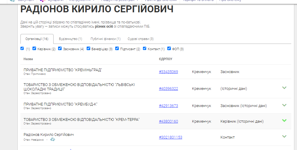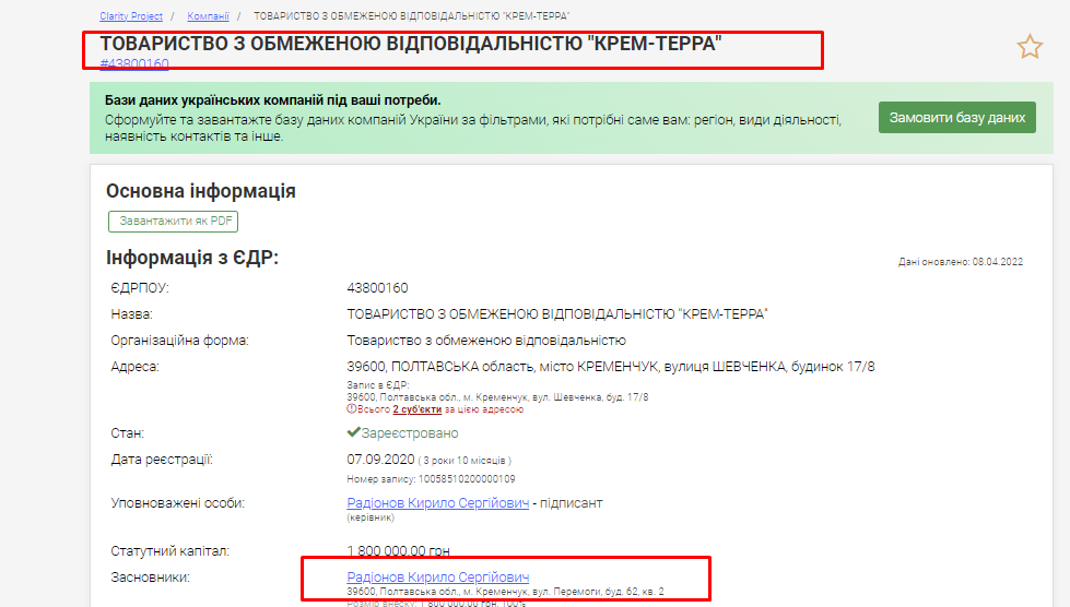 За даними відкритих реєстрів, засновник компанії Крем-Терра (діяльність у сфері фотографії) — Радіонов Кирило Сергійович.