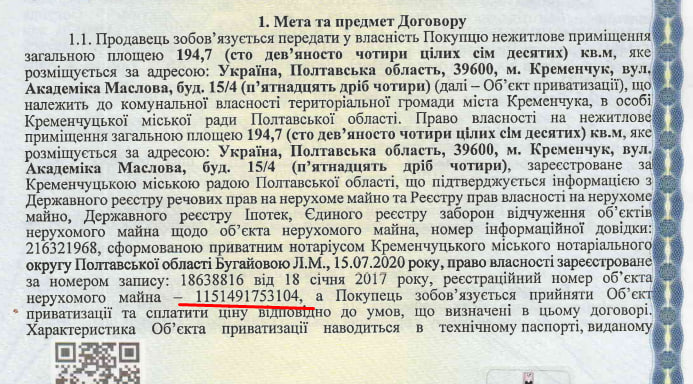 У листопаді 2019 року орендарю дають добро згоду на здійснення невід’ємних поліпшень. Підприємець вкладає у ремонт понад 86% від «ринкової вартості об’єкта». У квітні 2020, у самий розпал «ковіду», орендоване приміщення включають до списку об’єктів, що підлягають приватизації. У той же ковідний липень, міська влада погоджує умови продажу (близько 620 тис. грн) та підписує з орендарем договір купівлі-продажу. Згідно з курсом валют на день укладення договору (27,15 грн за дол), кременчуцька громада за приміщення на перетині Соборної та Перемоги, розміром з дві трикімнатні «хрущовки» отримала приблизно за $23 тис. Ось скрін з договору купівлі-продажу від 15.07.2020 р.