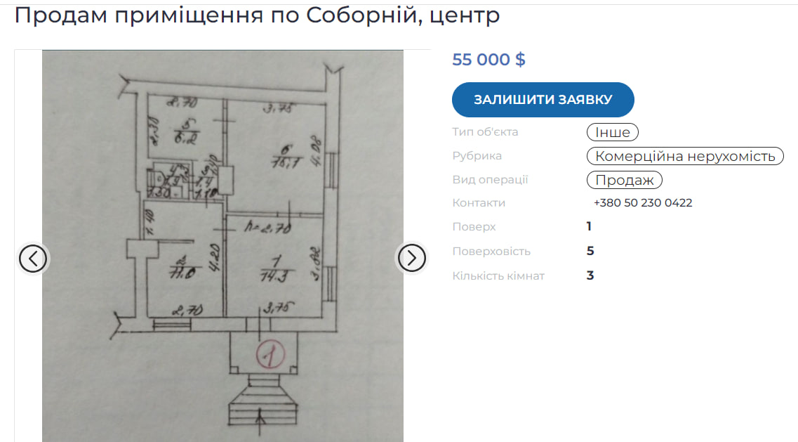 А от приміщення для бізнесу у центрі коштує в 4 рази дорожче. Приклад продажу трикімнатного офісу по вул. Соборній. Вартість — близько $1200 за кв. м.