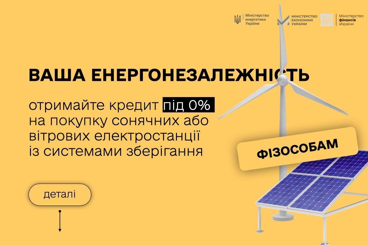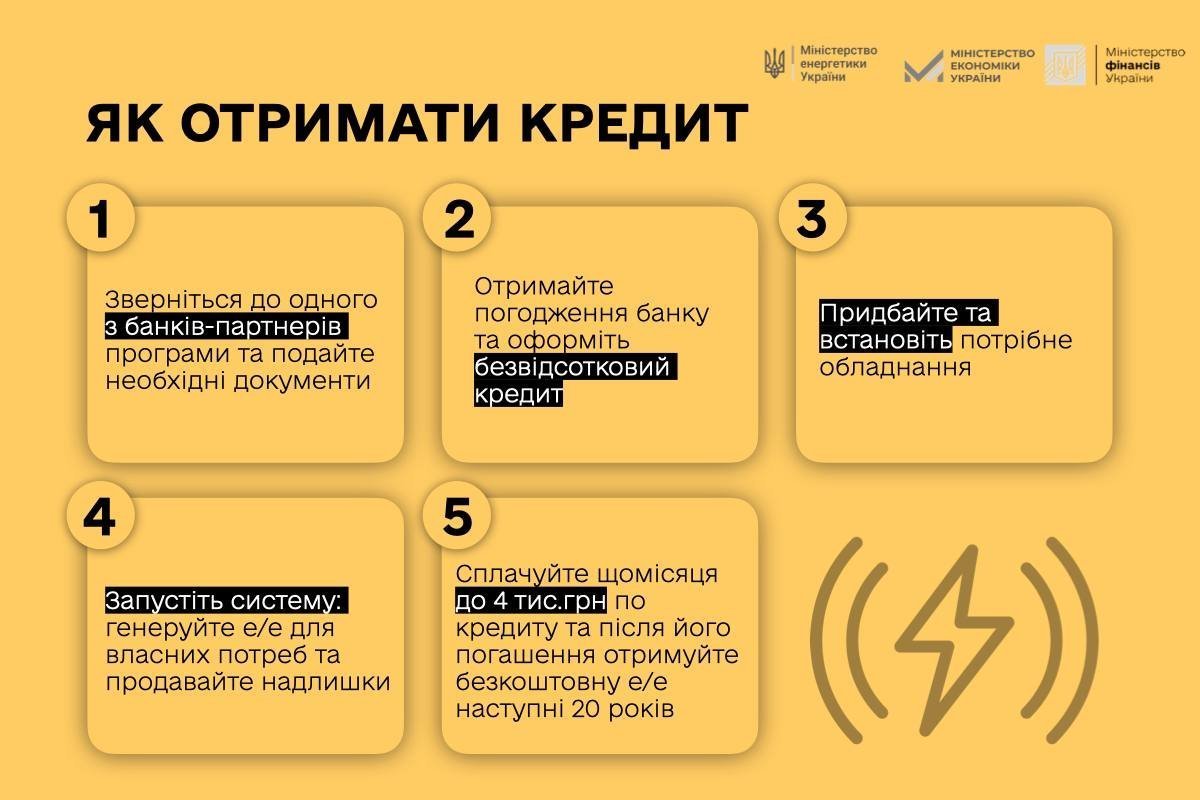 На придбання обладнання для приватних домогосподарств потужністю від 1 до 10 кВт держава надає пільгові кредити на суму до 480 тисяч гривень зі ставкою 0%.