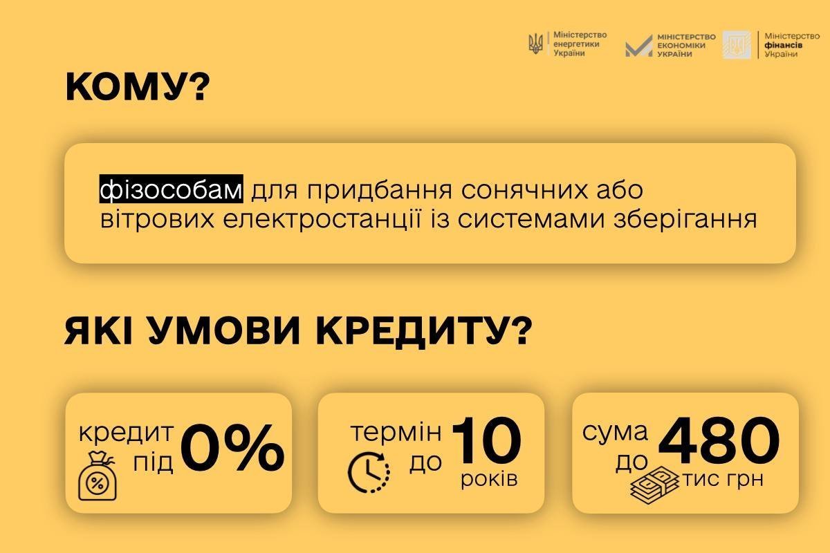 Він зазначив, що кредит під 0% надають фізичним особам, які встановлять у власних домогосподарствах генерувальне обладнання. Сума кредиту – до 480 тисяч гривень. Термін – до 10 років. Щомісячний платіж становить до 4 000 грн.