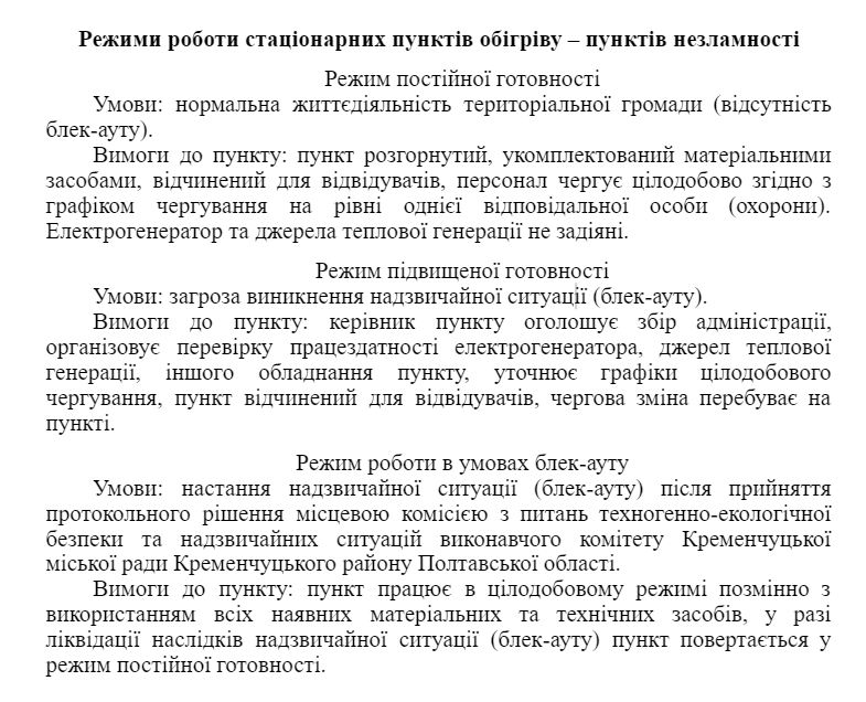 Водночас у додатку 3 до рішення №1965, зазначено, що Пункти незламності у громаді працюють у 3 режимах: