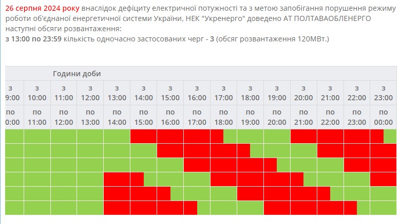Як повідомили у «Полтаваобленерго» з 14.30 і до кінця доби об'єм знеструмлень збільшили — одночасно застосовуватимуть 4 черги (обсяг розвантаження 160 МВт).