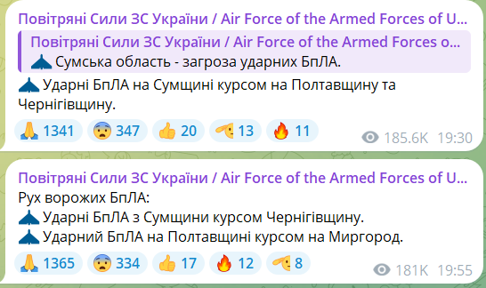 Повітряну тривогу в області оголосили о 19.30. Спочатку у Повітряних силах попереджали про рух ударних БПЛА на Полтавщину, зокрема на Миргород.
