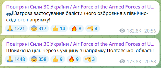 А вже близько 20.58 з’явилася інформація про загрозу балістичного обстрілу та швидкісну ціль у напрямку області.