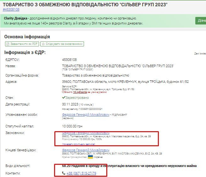 За вказаними адресами по вул. Троїцькій та вул. Маслова ми знайшли «двійника» «Сільвер Груп 2000» — компанію «Сільвер Груп 2023». Її засновник — Федосов Геннадій Михайлович. Пан Федосов як місце проживання вказав ту ж квартиру по вул. Академіка Маслова, що й пані Федосова. А його компанія також зареєстрована на вул. Троїцькій 61/52. Просто дві магічні адреси! В контактній інформації зазначений той самий номер телефону, що привів нас до колишньої очільниці юрвідділу міськвиконкому, Інги Капралової.