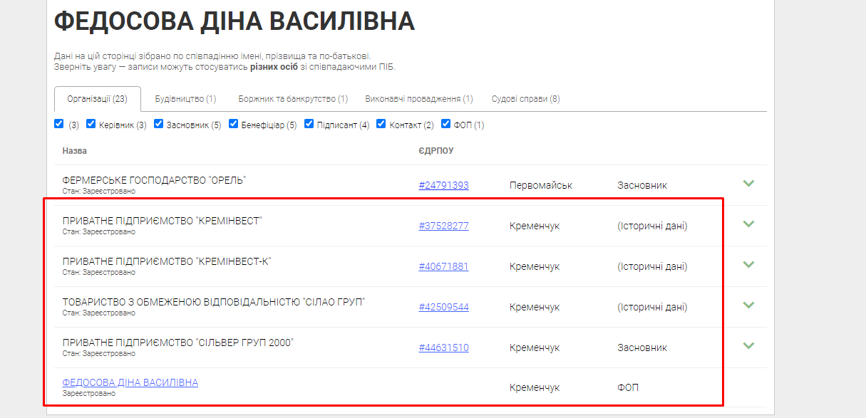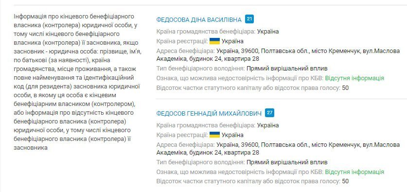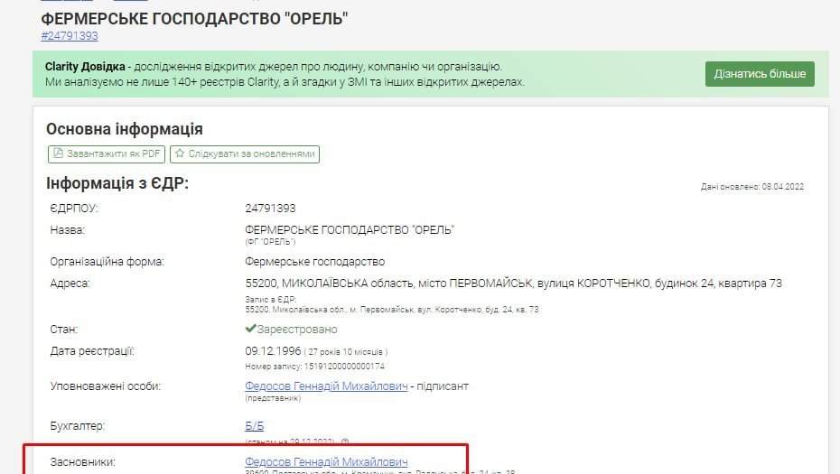 І ще один збіг: Геннадій Федосов та Діна Федосова значаться як бенефіціари фермерського господарства «Орель» у Миколаївській області, місто Первомайськ.