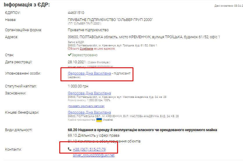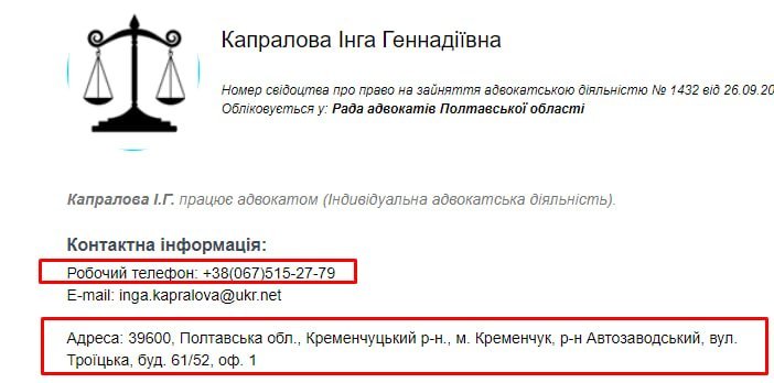 Однак «сезон чудес» тільки починається. Нам зустрівся ще один цікавий збіг. Компанія «Сільвер груп 2000», керівницею якої до вересня 2024 року була пані Федосова (місяць тому компанія змінила керівника та фізичну адресу), дивним чином у контактах вказала номер телефона, який Гугл ідентифікує як мобільний адвоката Інги Геннадіївни Капралової. Навіть адреса офісу пані Капралової, зазначена в інформаційному довіднику-реєстрі адвокатів, збігається з адресою компанії, заснованою пані Діною: вул. Троїцька 61/52, офіс 1. Невже дві бізнес-леді ділили один офіс на двох?