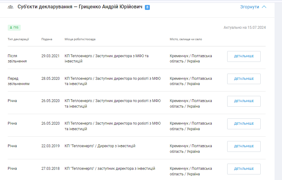 Також Андрій Гриценко до 2022 року подавав декларації як заступник директора з інвестицій комунального підприємства «Теплоенерго».