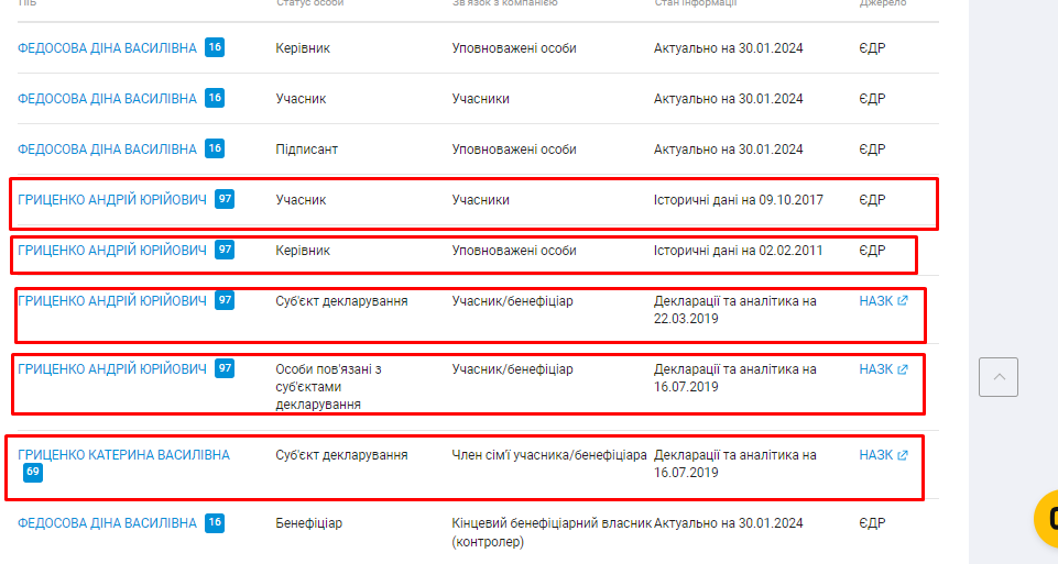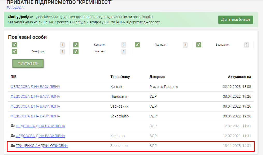 Зокрема, серед них — «КРЕМІНВЕСТ». А серед історичних засновників «КРЕМІНВЕСТу» ми побачили Андрія Юрійовича Гриценка: його прізвище значиться ще у 2019 році як учасника/бенефіціара.