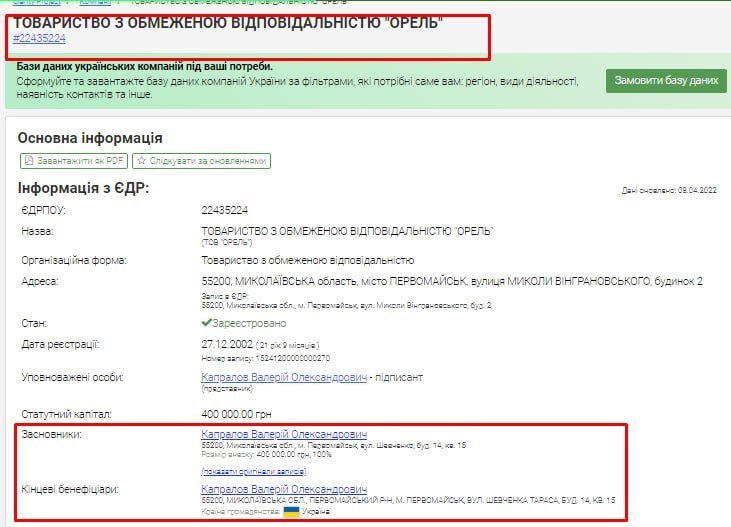 А у Первомайську як раз існує і ТОВ «Орель», засновник — Капралов Валерій Олександрович.