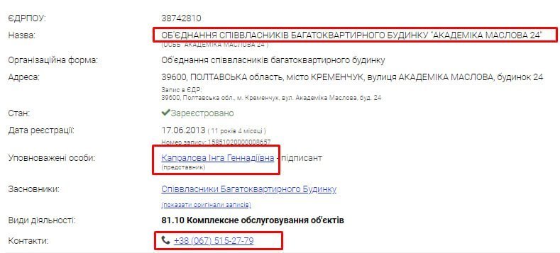 Який зв’язок між колишньою посадовицею та групою підприємців? За даними з реєстрів, пані Капралова є уповноваженою особою в ОСББ будинку по вул.Академіка Маслова, 24 — саме цей будинок обидва підприємці вказали як свою адресу. До речі, номер телефона пані Капралової з держреєстру ідентичний номеру, що вказують Федосові у своїх компаніях.