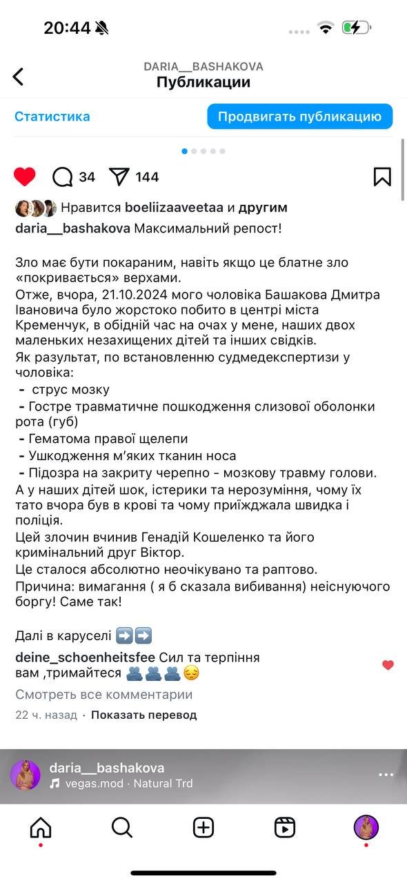 Вона додала, що наразі у Дмитра Башакова діагностовано струс головного мозку, гематома шелепи, пошкодження губ та носа і є підозра на закриту черепно-мозкову травму. І повідомила, що його запросили на допит до поліції, як постраждалого, на понеділок, 28-го жовтня.