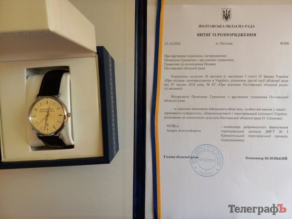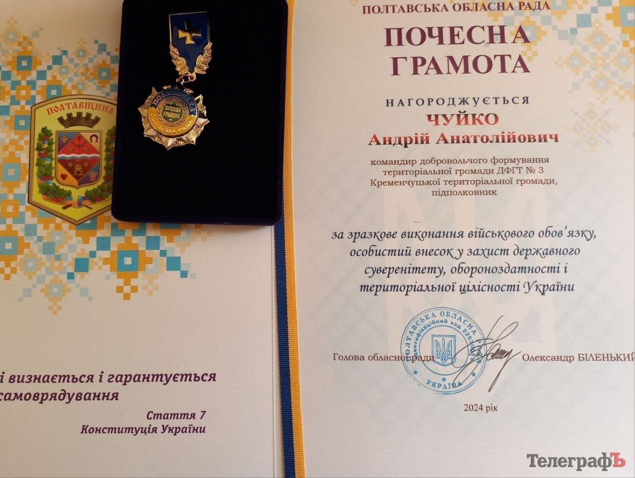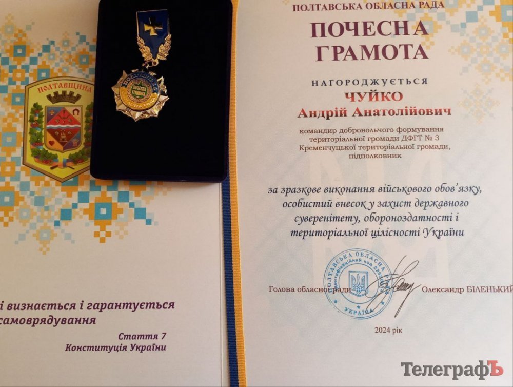 Командира ДФТГ №3 Кременчуцької територіальної громади підполковника у відставці Андрія Чуйка Полтавська обласна рада нагородила Почесною грамотою та іменним годинником за «зразкове виконання військового обов’язку, особистий внесок у захист державного суверенітету, обороноздатності та територіальної цілісності України».