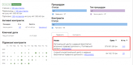 А також зустріли на просторах інтернету адвоката з ідентичними ініціалами. А в системі закупівель — успішного підприємця, що надає юридичні послуги. Виграв 188 тендерів зі 188. Зокрема, за надання безоплатної вторинної допомоги у Полтавській області отримав з бюджету майже 400 тис. грн (2022-2024 роки).