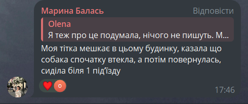 Увесь день у соцмережах містян непокоїла доля песика, з яким гуляла жінка. У коментарях у телеграм-каналі «Кременчуцького Телеграфа» очевидці написали, що собака спочатку злякався і втік, але за якийсь час повернувся й сидів під під'їздом. Згодом господар, чоловік постраждалої, песика спіймав.