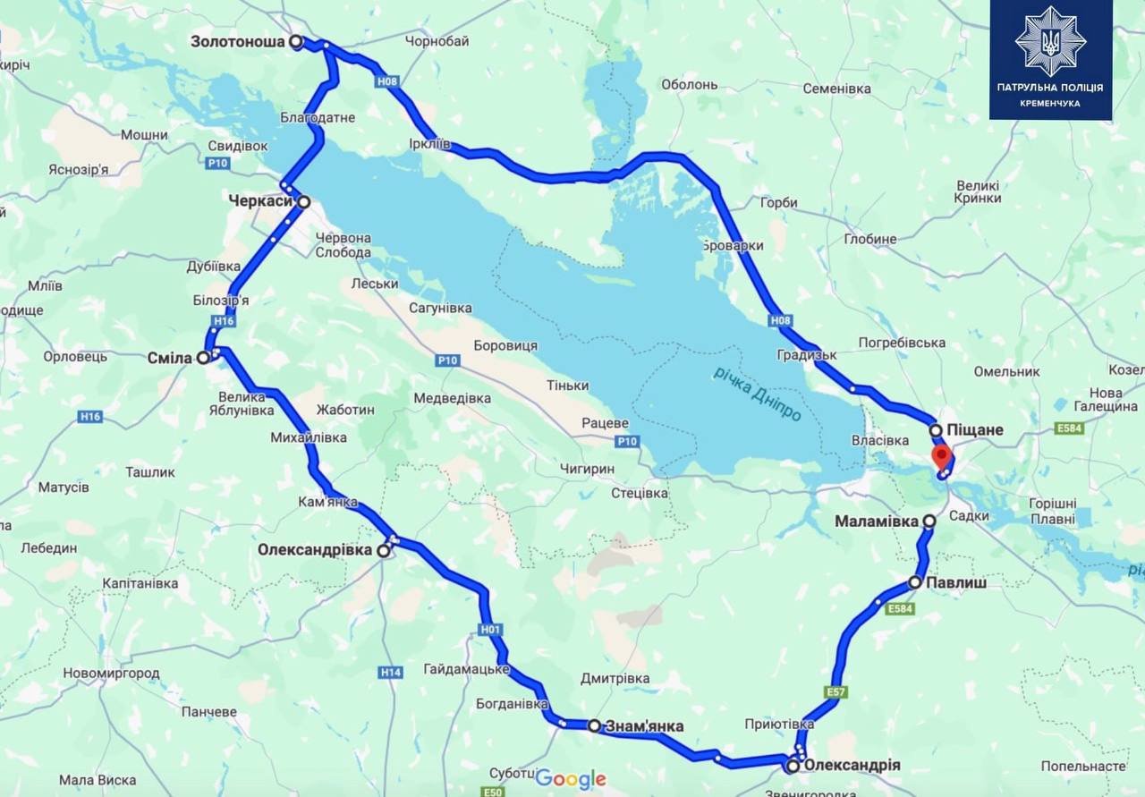 У Світловодську поблизу Кременчука перекрили рух автотранспорту через Дніпро. Через це у патрульній поліції розробили маршрут об'їзду, інформують у пресслужбі патрульної поліції Кременчука.