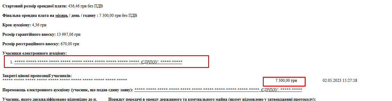 І тут же поквапом оголошують конкурс оренди. Учасники мали бути просто суперменами, аби встигнути з подачею документів — для збору паперів мерія надала лише три робочі дні! Не дивно, що на все місто знаходиться лише одна така компанія-чемпіон. 4 травня 2023 року проходить аукціон оренди. Його виграє єдиний учасник. Вартість оренди 104 кв. м. — 7,3 тис. грн.